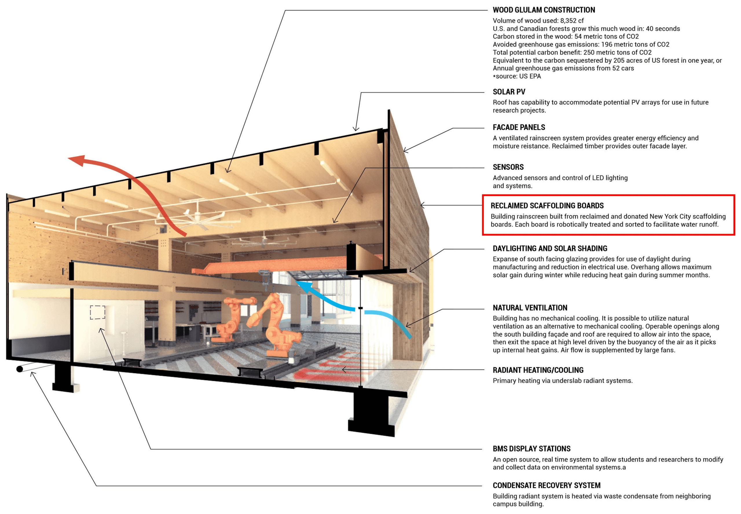 While our proposal incorporated many sustainable elements, one of the project's most innovative aspects was the facade, which was composed entirely of scaffolding planks reclaimed from construction sites around New York City. In order to work with the natural variation of the boards (which vary widely in width, thickness, length, and color) and develop a cohesive facade layout, we developed a custom digital imaging pipeline to catalog all boards and created various computational model to efficiently lay them out across the building's facade.